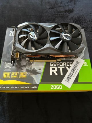 Tarjeta gráfica ZOTAC Gaming GeForce RTX 2060 con 6GB de memoria GDDR6. Nunca minada ni overclock agresivo, usada para gaming normal. Ideal para jugar a 1080p a 60fps estables en la mayoría de juegos actuales o a altísimos FPS en juegos competitivos (Valorant, CS:GO, Fortnite). Se entrega en su caja original. Muy muy poco uso y funciona perfectamente. Entrega a mano o envío por wallapop
