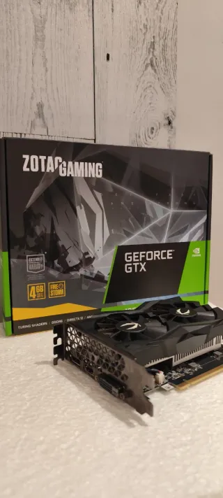 Vendo tarjeta gráfica Zotac Gaming GeForce GTX 1650 AMP Core de 4GB GDDR6. Es una gráfica ideal para montar un PC gaming de entrada económico o para actualizar un equipo de oficina y jugar a 1080p sin problemas. Estado del producto: Funciona perfectamente. Nunca se ha usado para minería, solo uso doméstico (gaming ligero y ofimática). Especificaciones destacadas: Memoria: 4GB GDDR6 Refrigeración: Doble ventilador Alimentación: No requiere cable de alimentación extra de la fuente (se alimenta directo del puerto PCIe), lo que la hace compatible con casi cualquier PC. Salidas: DisplayPort 1.4, HDMI 2.0b, DVI-D.