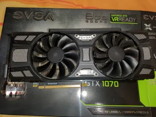 Tarjeta gráfica EVGA GeForce GTX 1070 SC Black Edition con 8GB de memoria GDDR5. - Modelo SC Black Edition. - Refrigeración ACX 3.0. - En perfecto estado de conservación y funcionamiento, con sus cajas originales, poster y sticker. - Realizado mantenimiento (cambio de pasta térmica y limpieza) a día 30/11/25 - Aún da la talla para juegos actuales, cambiada por modelo superior.