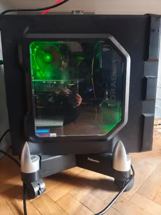 Ordenador de sobremesa con un diseño llamativo y componentes visibles a través de su panel lateral. - Procesador i7-8700 CPU 3.20G. - 16 GB RAM DDR4. - tarjeta gráfica Nvidia GTX 1060 6 GB. - Disco duro SSD 223Gb. - Disco duro HHD 2TB. - Lector DVD LG. - Panel lateral transparente. - Iluminación LED verde. - Base con ruedas para fácil movilidad.