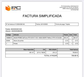 Tarjeta gráfica ASUS Prime GeForce RTX 5070 Ti con 16GB de memoria GDDR6X. - Modelo OC (Overclocked). - Diseño de triple ventilador para una refrigeración óptima. - Compatible con Ray Tracing y NVIDIA DLSS4, comprada el 02/10/25, demostrable, con factura, está como nueva, se vende por cambiar a superior.