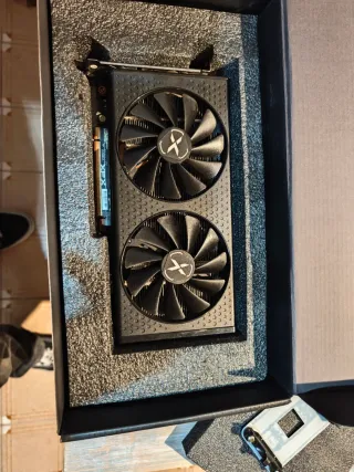 Tarjeta gráfica de ordenador con un diseño moderno y dos ventiladores para una mejor refrigeración. El numero de serie es V4V024469. El modelo es AMD Radeon RX 580-8GB, cuenta con 8GB - Cubierta con acabado de fibra de carbono. - Ventiladores con logo XFX Graphics.