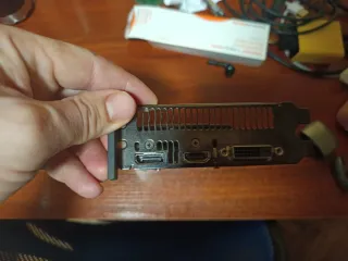 Tarjeta gráfica Palit HD 2600 Pro. Núcleo RV630 a 600 MHz, 512 MB de GDDR3 en bus de 128 bits, 120 shaders, TDP de unos 45-60 W y soporte para PCI-E x16 o AGP en algunas ediciones. Incluye salidas DVI y TV-out, con opción de adaptador HDMI para video HD 1080p vía UVD. En su momento funcionaba, pero ahora ya no puedo volver a comprobarlo. Sin garantía.