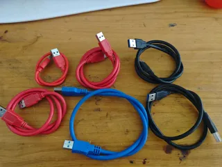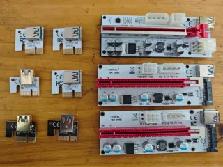 Conjunto de risers y cables para rig de minería cripto criptomonedas. Para colocar GPUs tarjetas gráficas BTC minería criptomonedas crypo - 6 cables USB a USB de diferentes longitudes. - Incluye varios risers y adaptadores, lo que se ve en las fotos: PCR to pce - 3 PCE2PCE NL4 - 2 PCE2PECE N09 - 1 VER006 - 3 Chipal PCI-e 1x to 16x VER 008S (uno se me olvidó añadirlo a la foto) - 1 PCE164P N09 Todo ok. Se dejaron de usar he ido vendiendo el resto me quedan cables de alimentación varios, cables de alimentación para discos sata etc.
