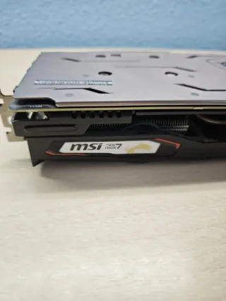 Tarjeta gráfica MSI GTX 1060 con 6GB de memoria VRAM. Diseñada para un rendimiento potente en juegos y aplicaciones exigentes. Se ha limpiado a fondo y cambiada la pasta térmica.