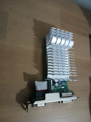 Tarjeta gráfica NVIDIA GeForce con disipador y ventilador. - Conexiones: VGA, DVI. - Componentes electrónicos visibles en la placa. -Está sin uso. La compré para mi ordenador y no es compatible.