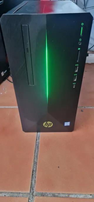 PC HP para gaming con un diseño moderno y llamativo. Caracteristicas: i5-8400 de 6 nucleos, 12 GB de memoria DDR4, gráfica GTX 1050, disco M2 de 128GB + HDD 1TB, wifi, bluetooth, lector de tarjetas SD. Destaca por su iluminación frontal en color verde. S.O. Windows 11 original, tambien lleva Office 2024.