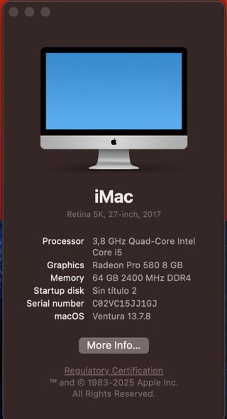 Vendo mi iMac por cambio de configuración de estudio. Todo perfecto. Editando video y foto hasta hoy. Este iMac de 27 pulgadas con pantalla Retina 5K de 2017 ofrece un rendimiento excepcional. Cuenta con un procesador Intel Core i5 y una tarjeta gráfica Radeon Pro. - Pantalla: Retina 5K, 27 pulgadas, 2017 - Procesador: 3,8 GHz Quad-Core Intel Core i5 - Gráficos: Radeon Pro 580 8 GB - Memoria: 64 GB DDR4 a 2400 MHz - Disco: SSD 1Tb - Número de serie: C02VC15JJ1GJ - macOS: Ventura 13.7.8