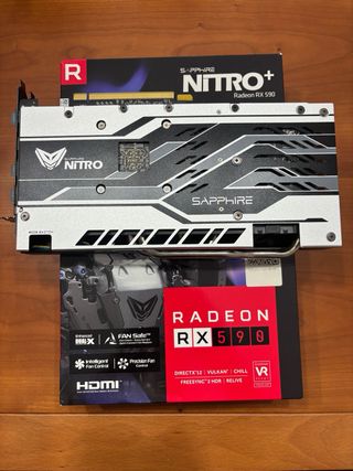 Tarjeta gráfica AMD Radeon RX 590 de Sapphire, modelo Nitro+. Muy poco uso, aproximadamente 250 horas. Funcionamiento verificado con CPU-Z (foto incluida). En caja original con todos los accesorios. • 8 GB GDDR5 (Micron) • TDP: 225W • Dual ventilador NITRO con control inteligente • FreeSync 2 HDR, DirectX 12, Vulkan • Salidas: HDMI + DisplayPort Se vende por actualización de equipo. No minada ❗️ Recogida en Mataró o envío a cargo del comprador.