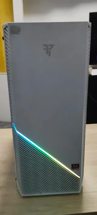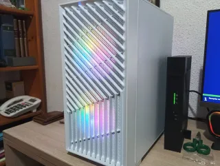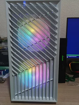 Torre de PC gamer con un diseño moderno y elegante. Cuenta con iluminación RGB frontal. - Panel frontal con diseño de líneas diagonales. - Logo de la marca en la parte superior. - Detalle de iluminación LED en la parte inferior frontal. Intel core i3 6600.ventilador d e apoyo grande nuevo multicolor. 16 GB ddr 3200 corsair vengance lpx con disipador.tarjeta gráfica Nvidia de 4 GB.disco duro SSD 500 GB.lateral transparente metraquilato.windows 11 pro activado.va muy fluido recién formateado y actualizado.solo tiene es golpe en la esquina que no afecta a nada al pc.ese golpe se hizo con la caja vacía cayó al suelo.va muy fluido el p