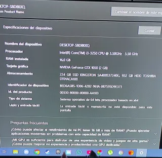 Ordenador de sobremesa con buenas especificaciones para uso general y gaming. - Procesador: Intel Core i3-3250 a 3.50 GHz - Memoria RAM: 16 GB - Tarjeta Gráfica: NVIDIA GeForce GTX 1050 (2 GB) - Almacenamiento: SSD 224 GB KINGSTON + HDD 932 GB TOSHIBA - Sistema Operativo: 64 bits. También lo cambio por ps5 o Xbox series. En la venta o cambio, regalo también varios teclados de luz. Precio no negociable.