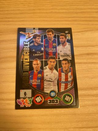 Tarjeta de colección Card Invencible de Adrenalyn XL, edición 2014-2015. - Incluye a varios jugadores destacados. - Diseño con detalles gráficos y números de estadísticas.
