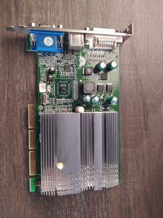 Gráfica GeForce FX 5200 se 128 Mb para sobremesa retro, se conecta por puerto AGP, viene con tres salidas VGA, DVI y TVout. No probada por falta de equipo para ellos.