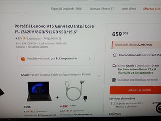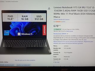 Portátil Lenovo V15 G4 IRU Intel Core i5-13420H/16GB/SSD512GB/15.6" 💻 Portátil Lenovo V15 G4 IRU 📦 Incluye caja original, cargador y documentación ✨ Estado NUEVO ABIERTO SOLO PARA COMPROBAR QUE LLEVA TODO ✅ Funciona perfectamente garantía lenovo 3 años 📦 Lo vendo porque no le doy uso 🔄 Se entrega WINDOWS 11 PRO, nuevo 🔹 Procesador: Intel Core i5-13420H (13ª generación)8 núcleos, 12 hilos turbo máxima de 4.6GHz, 12 MB 🔹 Tarjeta gráfica Intel® UHD Graphics for 13th Gen Intel® Processors 🔹 RAM:16GB DDR4 32OO 🔹 Almacenamiento: SSD de 512 GB 🔹 Pantalla: 15.6” FHD (1920 x 1080)TN, 250 nits, antirreflejo, 45 % NTSC 🔹 Teclado