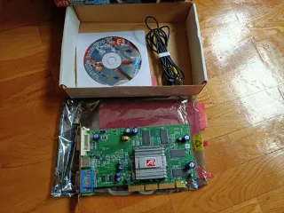 Tarjeta gráfica AGP R9250 con 256MB de memoria. - Salidas VGA, TV-Out (TVO) y DVI. - Incluye CD de drivers y cable. - Componentes electrónicos visibles en la placa. No sé ha usado solo probada y funciona bien.