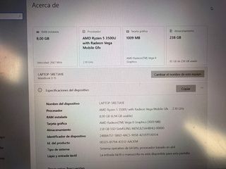 Portátil Huawei Matebook 15 con procesador AMD Ryzen 5. - 8 GB de RAM instalada. - Almacenamiento de 238 GB SSD. - Tarjeta gráfica AMD Radeon Vega. - Pantalla de 15 pulgadas. - Tiene alguna marca visible de uso