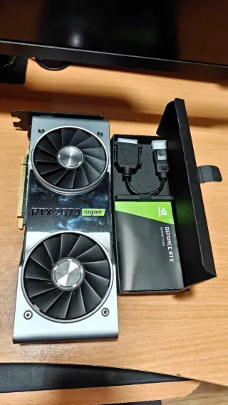 Tarjeta gráfica NVIDIA GeForce RTX 2070 Super Founders Edition. Ideal para jugar a todo en 1080p Ultra o 1440p (2K) con muy buenos FPS. Especificaciones clave: Memoria: 8GB GDDR6 Núcleos CUDA: 2560 (Turing). Tecnologías: Soporta Ray Tracing y DLSS Puertos: 3x DisplayPort 1.4, 1x HDMI 2.0b y USB-C Alimentación: Requiere conectores de 6+8 pines (Fuente recomendada: 600W-650W). Usada para juegos. Funciona perfectamente. #radeon #ordenador #pc #graficos