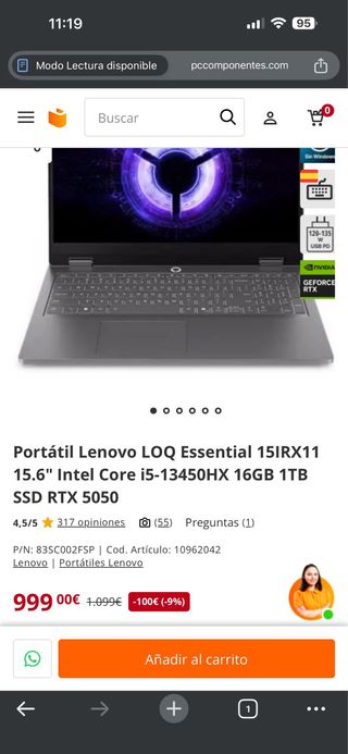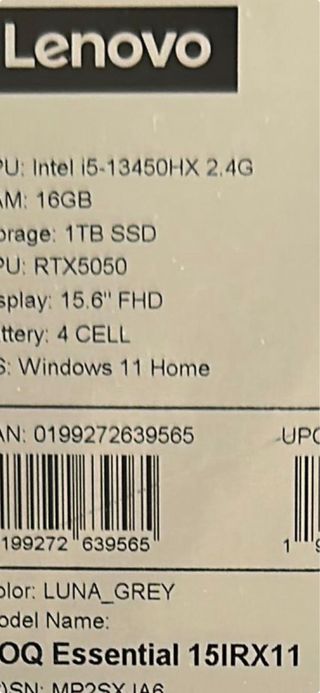 Portátil Lenovo LOQ Essential 15IRX11 en color gris. COMPLETAMENTE NUEVO Y PRECINTADO - Procesador: Intel i5-13450HX 2.4G - Memoria RAM: 16GB - Almacenamiento: 1TB SSD - Tarjeta Gráfica: RTX5050 - Pantalla: 15.6 FHD - Batería: 4 CELDAS - Sistema Operativo: Windows 11 Home
