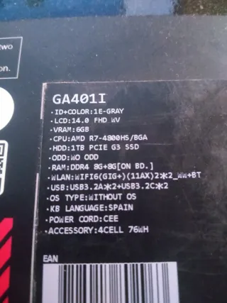 Portátil ROG Zephyrus G14 GA401I en color gris. PANTALLA ROTA! HAY QUE CAMBIARLA. Funda de REGALO - Pantalla LCD de 14.0 FHD WV. - Procesador AMD R7-4800HS/BGA. - Almacenamiento SSD PCIe G3 de 1TB. - Memoria RAM DDR4 de 16GB (8GB+8GB). - Conectividad WiFi 6 (Gig+) y Bluetooth. - Puertos USB 3.2 Gen 2 Tipo A y Tipo C. - Sin sistema operativo preinstalado. - Teclado en español. - Batería de 4 celdas y 76Wh.
