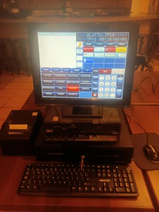 TPV táctil compuesto de un PC hp usado y pantalla táctil IBM nueva a estrenar. incluye cables, teclado y ratón. sin impresora ni cajón de monedas.