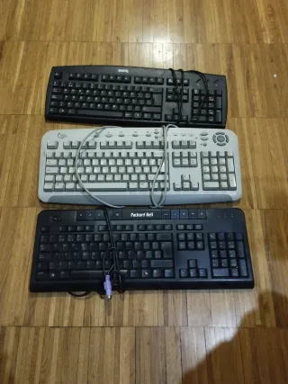 Conjunto de tres teclados con conexión PS/2. - Teclado Benq en color negro. - Teclado Logitech en color gris. - Teclado Packard Bell en color negro. Están usados y con restos de polvo marcas de uso. No testados. Sueltos a 4€ Vintage, Windows, ibm, packard bell, msdos. Armario escorial abajo izquierda
