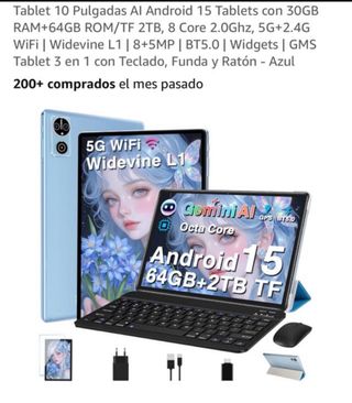 Tablet de 10 pulgadas con sistema operativo Android 15. Incluye teclado, funda y ratón. - 30GB de RAM y 64GB de ROM. - Procesador de 8 núcleos a 2.0Ghz. - Conectividad 5G y WiFi. - Ampliable con tarjeta TF de hasta 2TB. - Cámara de 8+5MP y Bluetooth 5.0. - Color azul.