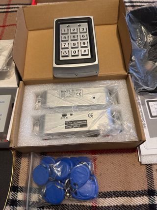 Kit completo para control de acceso de puertas con tecnología RFID. Incluye teclado numérico, lector de llaves, botón de salida, cerradura eléctrica y fuente de alimentación. KUMU Sistema de Control de Acceso de Puerta RFID Impermeable al Aire Libre Teclado de Metal Cerradura Electrónica+Cubierta a Prueba de Lluvia+Botón de Salida+Llaveros de 15pcs para el Hogar/Oficina - Teclado numérico con cubierta protectora. - 15 llaves RFID de acceso. - Cerradura eléctrica de alta seguridad. - Botón de salida para puerta. - Fuente de alimentación y control. ABIERTA LA CAJA PARA COMPROBAR SU CONTENIDO.