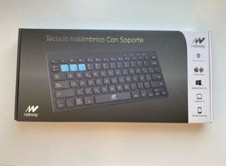Teclado inalámbrico con soporte, ideal para tu espacio de trabajo. - Diseño compacto y moderno. - Teclas con acabado azul. - Color principal negro. Como nuevo Compatible con Android y Apple