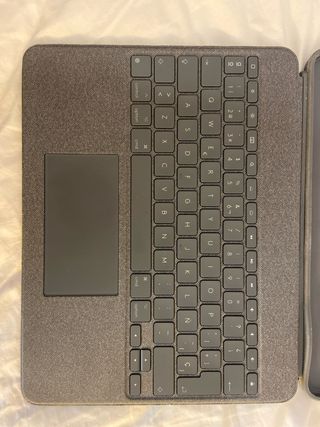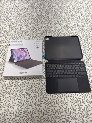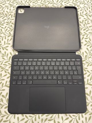 El teclado esta perfecto y la funda tiene los bordes desgastados. Funda protectora para iPad con teclado integrado. Tengo la caja original. - Diseño elegante en color gris. - Teclado QWERTY con trackpad. - Logotipo de Logitech visible.