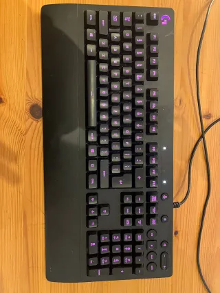 Teclado Logitech con retroiluminación. - Diseño en color negro. - Teclas con iluminación en tono morado.