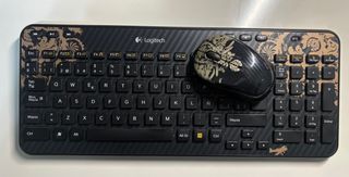 Conjunto de teclado y ratón inalámbricos con un diseño elegante. - Acabado en negro con detalles dorados. - Ideal para uso diario.