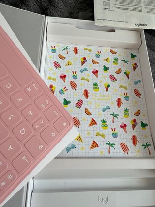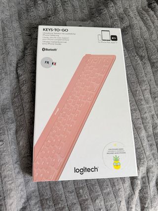 Está nuevo, no se ha llegado a usar La distribución del teclado es francesa (AZERTY) Teclado ultraplano Logitech Keys-To-Go en color rosa. Diseñado para ofrecer una experiencia de escritura cómoda y portátil. - Conexión Bluetooth. - Soporte integrado para iPhone. - Incluye pegatinas decorativas divertidas.
