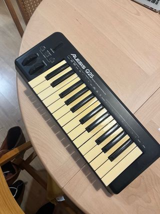 Teclado controlador MIDI Alesis Q25. - 25 teclas sensibles a la velocidad. - Ruedas de Pitch y Modulación. - Botones de Octava Arriba/Abajo. - Control de transporte y entrada de pedal. - Conexión USB.
