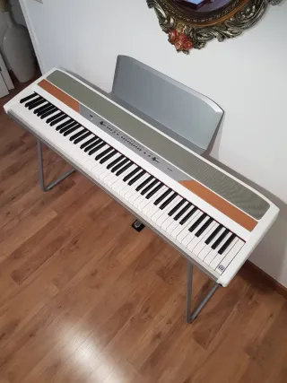 Piano digital Korg SP 250 con 88 teclas acción martillo que simula el peso del piano acústico 10 sonidos con 3 modos de audio Reverberancia con 3 modos Corus con 3 modos 3 niveles de sensibilidad al tacto Transponedor de tonalidad Posibilidad de unir sonidos Demo con 10 canciones presignadas Metrónomo 2 salidas auriculares estéreo Parte trasera: salida pedal sustain, conexión midi pc, salida estéreo amplificador Incluye transformador, soporte metálico y pedal sustain Tiene 4 desperfectos: la tecla La y la Sib más graves están desencajadas y no accionan y una marca en cada embellecedor plateado del panel frontal. Gracias