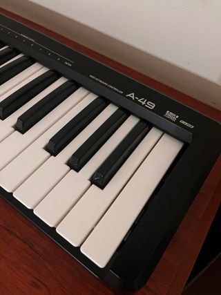 Teclado controlador MIDI Roland A-49 con 49 teclas sensibles a la velocidad. Ligero y cómodo, funciona por USB (no necesita enchufe). Tiene controles de pitch y modulación, knobs y botones configurables, D-Beam y entrada para pedal. Ideal para usar con ordenador, DAW o módulos MIDI. En muy buen estado.
