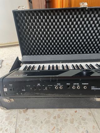 Teclado electrónico con un diseño moderno y compacto. - Teclas blancas y negras. - Panel de control con botones y diales. - Altavoz integrado. - Funda de transporte y pedal incluidos. - Negociable incluir midi y micrófono.