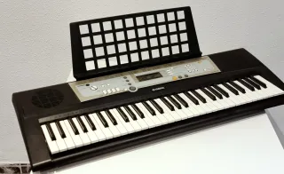 Teclado Yamaha PSR-175 (61 teclas) con atril para poner partituras y transformador. También funciona con pilas (incluye las 6 pilas) También incluye el pie. Todo está en perfecto estado. Se vende por separado también.