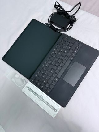 Microsoft Surface Pro 7 negro. Buen estado. Incluye teclado magnético original totalmente funcional. Tiene un pequeño desgaste en una esquina como he adjuntado en una de las fotos. También incluyo cargador original y caja original. La tablet funciona perfectamente. A nivel estético, tiene pequeñas marcas en algunas de las esquinas del uso normal. Cuenta con soporte trasero integrado (kickstand) para apoyarla en cualquier sitio. Memoria RAM: 8GB Disco duro: 256GB