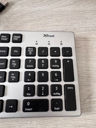 Teclado Trust en color negro. - Diseño compacto y ergonómico. - Teclas de perfil bajo para escritura silenciosa. - Conexión USB. Faltan unas letras con el uso como se puede ver en la foto