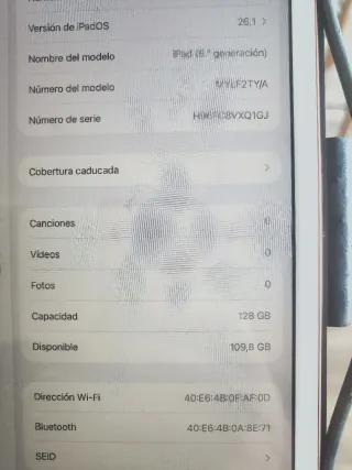 Estado perfecto sin arañazos, botones 100% funcionando. Se incluye funda con teclado logitech (con uso), no es nuevo ha sido usado evidentemente la bateria no esta al 100% pero funcionando muy bien. Entrega en mano para comprobar estado y evitar malentendidos cajas originales de ipad y teclado. Elche iPad de 8ª generación en color rosa y con 128 GB de capacidad. - Modelo: iPad (8ª generación) - Capacidad: 128 GB - Color: Rosa - Versión iPadOS: 26.1 - Número de modelo: MYLF2TY/A - Número de serie: H96FC8VXQ1GJ - Dirección Wi-Fi: 40:E6:4B:0F:AF:0D - Bluetooth: 40:E6:4B:0A:8E:71