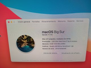 Apple iMac de 27 " i7 2.93 Ghz, Big sur (open core patcher) Grafica: Quadro k610M (1 gigas) Ram : 8 gigas( ampliable hasta 32) Disco Solido : 120 gigas ,Ideal como Pc de casa , ofimática( básica)navegar , ver Tv Tarjeta wifi dual band 5G Office (Word,Excel,power point,Excel)Activado de por vida. Acrobat DC Profesional Activado de por vida. En buen estado. Sin teclado y sin mouse. Testeado y funcionando al 100%, Solo tienes que encender y utilizarlo.