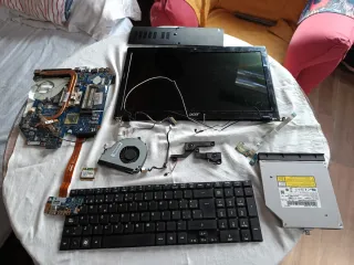 Conjunto de piezas de un portátil Acer. Mirar fotos serie y modelo. Se venden piezas sueltas también todo el conjunto 50€ - Placa base con disipador y ventilador. - Pantalla. - Teclado. - Lector DVD. - Altavoces. - Tarjeta Wi-Fi. - Cables y flex.