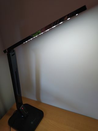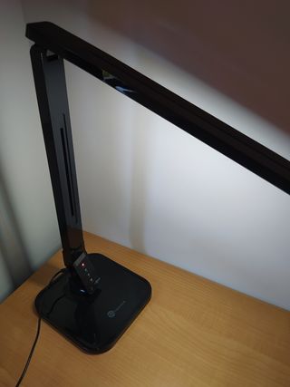 Lámpara de escritorio con varios colores de iluminación de amarillo a blanco frío, pudiendo ajustar la intensidad de la luz emitida. Control táctil, temporizador y Puerto USB. Se pliega por completo