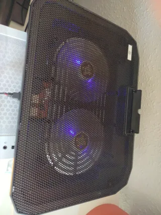 Base refrigeradora para portátil con iluminación LED azul. Funciona perfectamente, lo único que tiene algunas manchitas permanentes en la parte delantera como se ve en la foto. Lo vendo porque me va grande. - Diseño de malla metálica. - Ventilador central. - Patas antideslizantes. -Muy ligera. 29cm ancho x 35cm largo