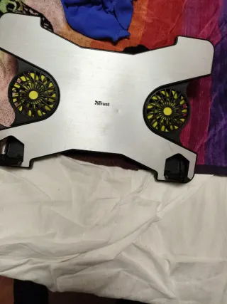 Conjunto de ventilador y disipador de calor para portátil. - Ventilador con aspas negras y detalles en colores. - Disipador de calor metálico con aletas. - Incluye cable de conexión.