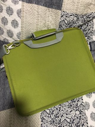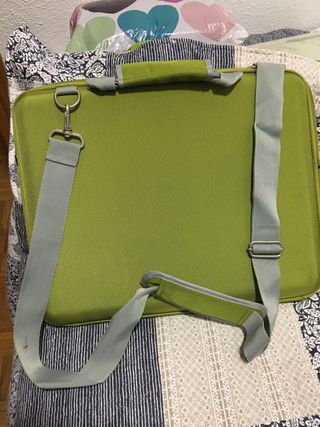 Funda para portátil en color verde. Cuenta con asa y correa. - Material resistente. - Cierre con cremallera. - Asa acolchada. - Correa ajustable.