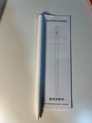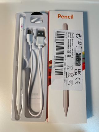 Lápiz táctil compatible con dispositivos. Es falso, comprado en internet, realiza exactamente las mismas funciones que el pencil original. Lo único, tiene una pequeña mancha rosa en el tapón del puerto (por haberlo pintado), fuera de eso está intacto. - Color blanco. - Incluye 2 puntas de repuesto. - Cable de carga USB incluido..