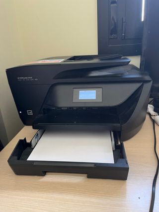 Impresora multifunción HP OfficeJet 6950 en color negro. Ideal para el hogar o la oficina. - Funciones: Impresión, fax, escaneo y copia. - Bandeja de papel frontal.