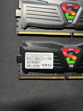 Conjunto de dos módulos de memoria RAM DDR4 de 8GB cada uno, con iluminación RGB. - Capacidad total de 16GB. - Velocidad PC4-24000 (3000MHz). - Latencia CL16-18-18-36. - Diseño con disipador negro y logo RGB. - Compatible con AMD Ryzen. Precio Negociable!