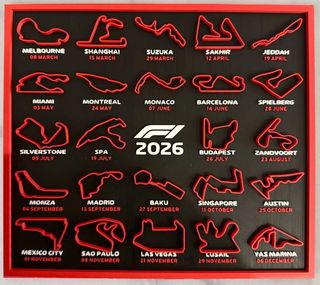 Calendario de la temporada 2026 de Fórmula 1. En el precio incluye 2 colores, si quieres 3 o mas colores consultar precio. Si quieres las dos patas para colocar sobre la mesa seria 2€ El tamaño es de 250x220 mm